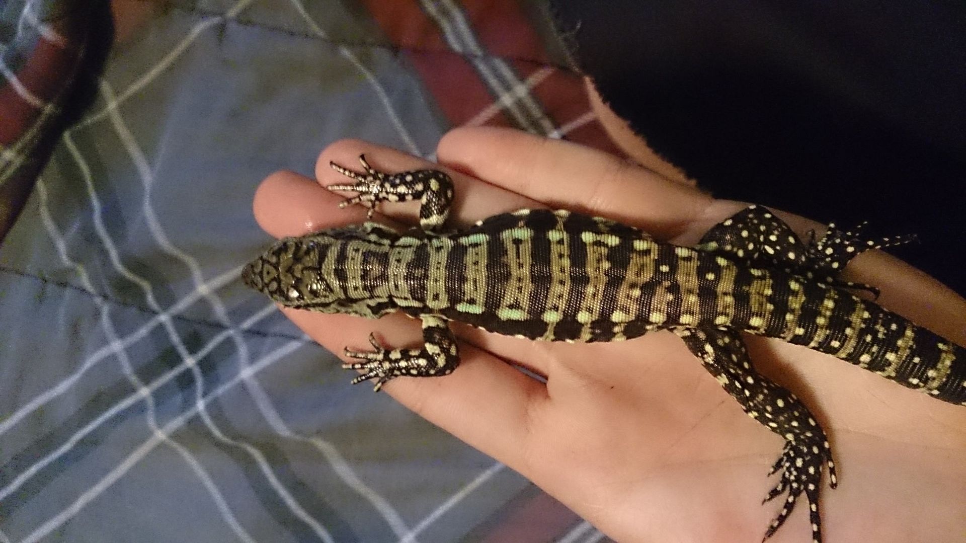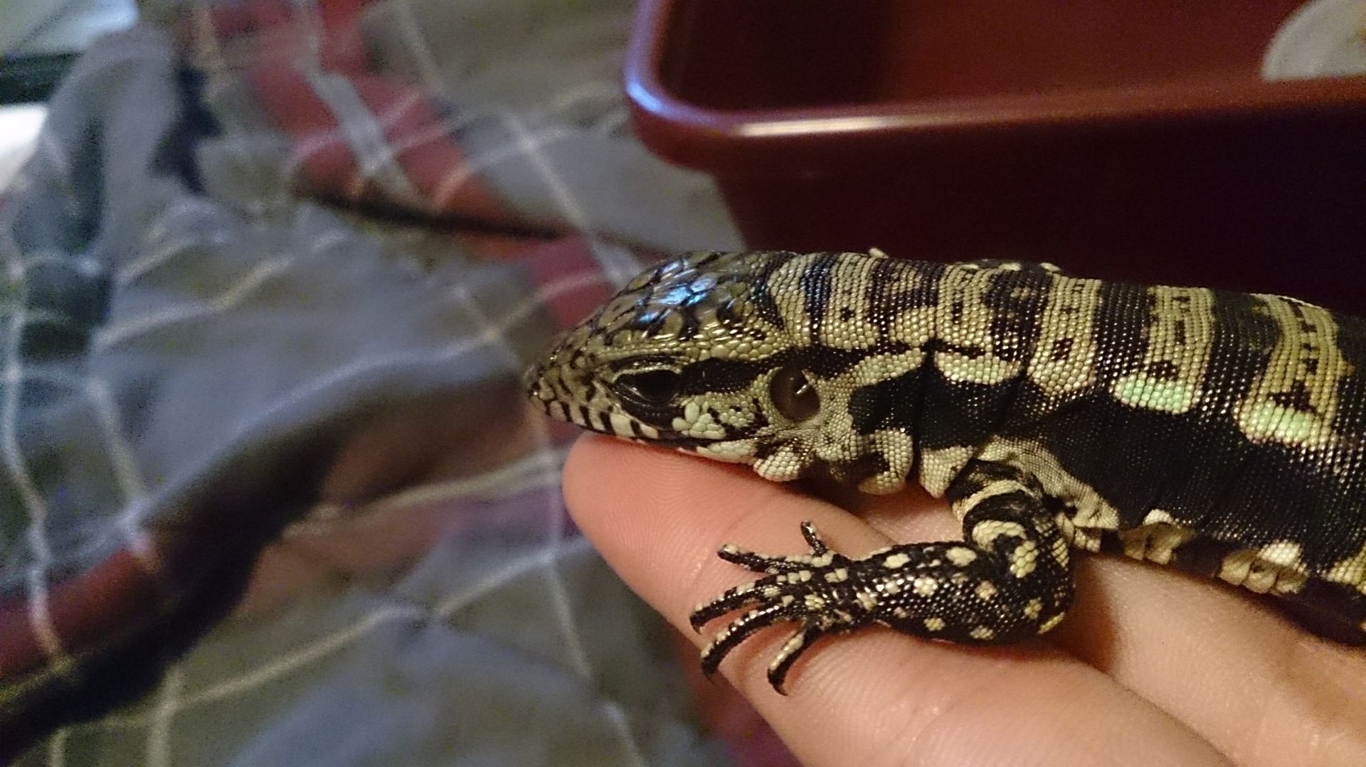 This is my second blue tegu Onix from Ty ( first one escaped from me outside my back door and was never able to capture it with traps etc) so I purchased another one this time a male. This boy is eating ground turkey with calcium plus inside like a champ. I received him a week and 5 days ago so not quite 2 weeks yet but hes already 42 grams. He is a bit skittish in the cage but soon as he comes out hes normal, walking hand to hand, and chills/falls asleep on me. So far really enjoying him and not taking him anywhere he could possibly escape from me until hes bigger lol. He doesnt seem to eat any fruit i have offered grapes, mango, blueberries, papaya and has no interest in anything else but ground turkey. Looking into trying other thinks like pinky mice and meal/horn worms.
